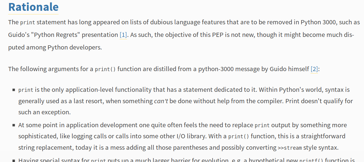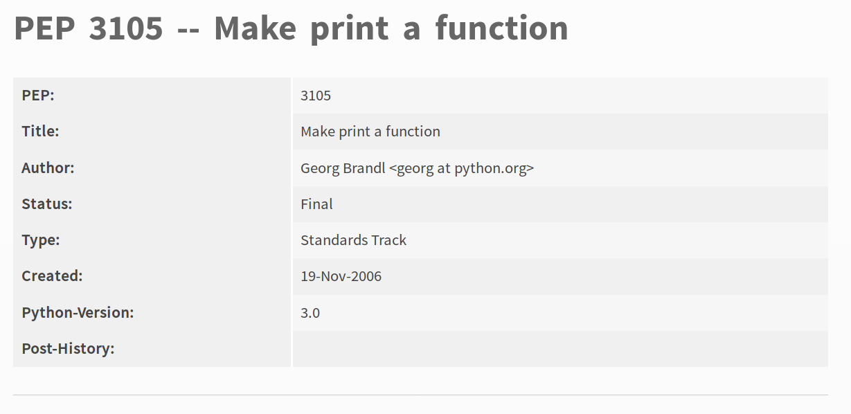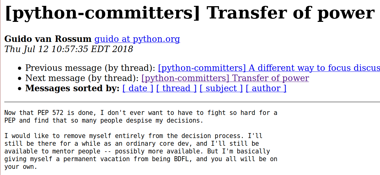 class: center, middle, vintage, splash # Como linguagens evoluem ― o jeito Python ### por [Felipe **"Bidu"** Rodrigues](https://felipevr.com) --- class: middle, vintage # Aperte a tecla `p` para ver as notas de aula! --- class: middle, vintage # Oi, eu sou o Bidu - felipe@felipevr.com - github.com/fbidu - Ciência da Computação - UNICAMP - Arquiteto de Infraestrutura no [Poppin](https://poppin.app/) --- class: middle, vintage # Agenda 1. Linguagens Naturais e Linguagens de programação 2. Python**s** 3. PEPs 4. O Desenvolvimento do Python 5. Assignment Expressions ??? - Hoje eu vou discutir com vocês sobre as mudanças em linguagens de programação, especialmente como esse processo acontece no Python - Depois eu vou falar um pouco sobre como acontece o desenvolvimento do Python em si - Por último eu vou falar um pouquinho de uma sintaxe nova que vai ser implementada no Python 3.8, que vai ser lançado no fim desse ano --- class: middle, vintage # Qual a diferença entre Português e Python? ??? - Pra começar a palestra de hoje, vamos considerar as diferenças entre essas duas linguagens - Podemos dizer que Português é uma linguagem "natural", que surgiu de forma mais ou menos espontânea entre as pessoas - Por outro lado, Python é uma linguagem totalmente "fabricada" --- class: middle, vintage  ??? - No entanto, as lingugagens naturais possuem regras, que às vezes são criadas artificialmente através de acordos e tratados - Em 2016 saiu o Novo Acordo Ortográfico do Português, que mudou algumas regras de escrita de alguma palavras --- class: middle, vintage  ??? - Então nós notamos que uma língua totalmente natural é impossível - Podemos então pensar que a divisão entre linguagens de programação e as outras significa que as línguas para comunicação entre pessoas surgem espontaneamente, e as linguagens de programação são artificiais --- class: middle, vintage # Saluton, kiel vi fartas? ??? - Isso significa "Olá, como vão vocês?" em Esperanto, uma língua totalmente artificial e criada pra tentar ser uma "língua universal" --- class: middle, vintage # Ambiguidades ### Onde Línguas Naturais e de Programação começam a se dividir ??? - Se tanto linguagens naturais como de programação podem ser artificiais, é nas ambiguidades onde elas começam a se separar --- class: middle, vintage, center  ??? - As ambiguidades tornam a comunicação menos clara e dependentes de contexto - Para que computadores consigam entender a gente bem é necessário que a comunicação seja o menos ambígua possível - Como a gente pode ver, linguagens naturais e de programação possuem mais semelhanças do que pode parecer num primeiro momento - No entanto, as linguagens naturais podem evoluir de uma forma mais orgânica. A gente pode simplesmente criar uma expressão nova e combinar entre nós o significado dela entre nós - Uma linguagem de programação, por outro lado, precisa de interpretadores, compiladores, conjunto de instruções de execução, etc - Obs.: As linguagens em que a gente escreve código podem conter ambiguidades, mas quando elas são parseadas e enviadas para o processador, essas ambiguidades são resolvidas. --- class: middle, vintage, center # _Python_**s** Observe o plural! ??? - Se as linguagens naturais mudam com o tempo, será que isso acontece com as de programação? --- class: middle, vintage ### Python 2: ```python x = int(raw_input()) for i in xrange(x): print i ``` ### Python 3: ```python3 x = int(input()) for i in range(x): print(i) ``` ??? - O primeiro código é válido para o Python 2 e absolutamente inválido para o Python 3. - A função raw_input e xrange não existem no Python 3 e o print mudou de formato - Por outro lado o segundo código é Python 3 válido, faz a mesma coisa que o primeiro e é compatível com Python 2! --- class: middle, vintage, center # PEPs [As Propostas de Melhoria do Python](https://www.python.org/dev/peps/) ??? - Python é uma linguagem Open Source, o que significa, entre outras coisas, que todo o código fonte que faz o Python funcionar e público e todos nós podemos acessar e colaborar com ele! - PEPs são documentos que propõem modificações na linguagem, nos métodos usados para decidir assuntos sobre o desenvolvimento e muito mais! - Eles também servem para coletar opiniões da comunidade sobre todos esses tópicos - Um PEP contém um resumo da ideia que está sendo apresentada, o contexto dessa ideia, a motivação e outros pontos importantes como as opiniões favoráveis ou não à ideia --- class: middle, vintage, center  [PEP 3105](https://www.python.org/dev/peps/pep-3105/) como o `print` virou `print()` ??? - Aqui nós temos um exemplo de PEP, a mudança do print como ele era em Python 2 para Pyhon 3 --- class: middle, vintage, center  O PEP inclui uma discussão histórica sobre o motivo da mudança ??? - O PEP inicia com uma discussão sobre o contexto da mudança. Por exemplo, fazer de print uma expressão e não uma função era um caso único no Python e que não se encaixava muito bem com o resto. Além disso, alguns casos de uso comuns do print se tornariam mais simples e diretos caso print fosse uma função. --- class: middle, vintage ## Quem decide que um PEP deve ser implementado ou não? --- class: middle, vintage 1. Uma discussão se inicia na lista de e-mails [Python-ideas](https://mail.python.org/mailman/listinfo/python-ideas) 2. Depois da ideia receber feedbacks e ser melhorada, ela é submetida para a lista [Python-devs](https://mail.python.org/mailman/listinfo/python-dev) 3. Mais discussão, mais feedbacks, se tiver um consenso, ela será implementada! ??? - Uma ideia não precisa começar com uma descrição completa e rica em detalhes - Ela pode começar simplesmente como uma discussão numa lista de e-mails chamada python-ideas - O autor da ideia deve ouvir os feedbacks que recebeu, melhorar a ideia e, caso decida continuar, ele pode submeter a ideia para a lista Python-De